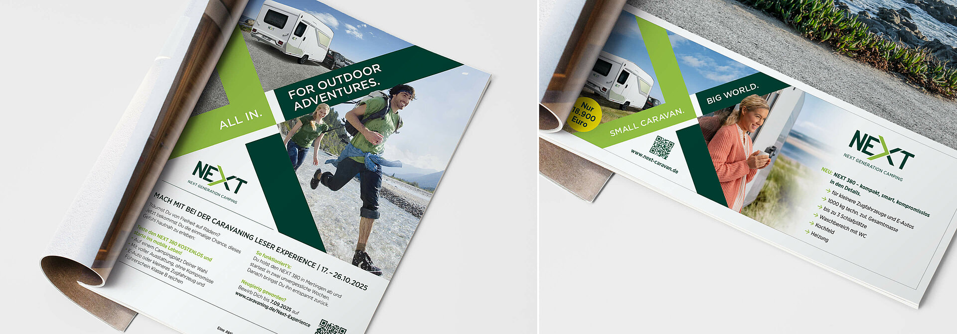 Freizeit, PR, Live-Kommunikation, Branding, Analog, digital„Einsteigen, ankommen, genießen – so leicht kann Camping sein.“ Mit diesem Versprechen startete die Marke NEXT aus dem Hause Fendt-Caravan ihren neuen ultraleichten Wohnwagen in einen gesättigten Markt. Unsere Aufgabe: Händler und die NEXT Generation von Campern gleichermaßen zu begeistern.