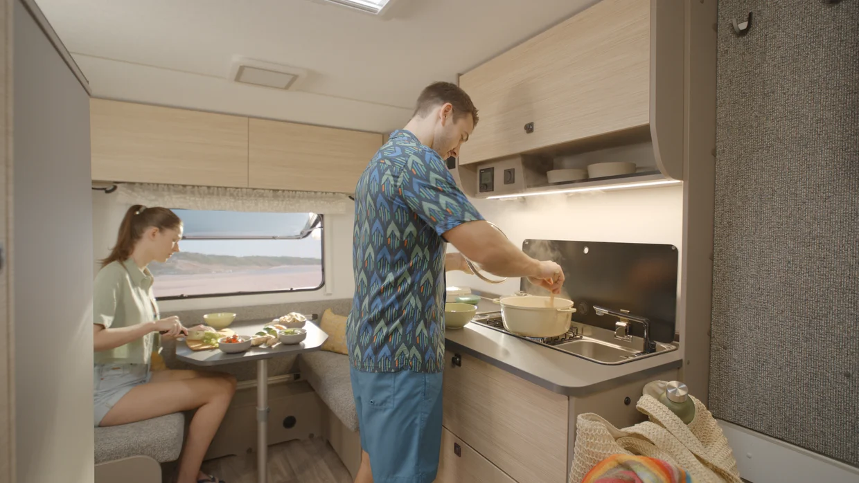 Mit NEXT hast du dein Restaurant immer dabei! In der kleinen Küche mit 2-flammigem Gasherd, Doppeltür-Kühlschrank und viel Stauraum kannst du deine Sterne-Leidenschaft überall ausleben!