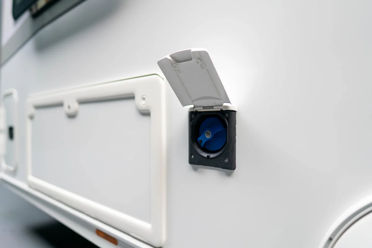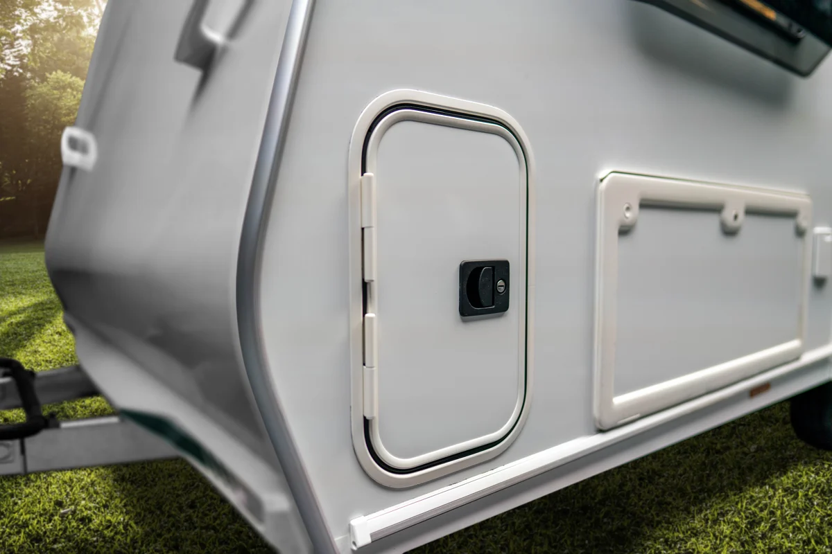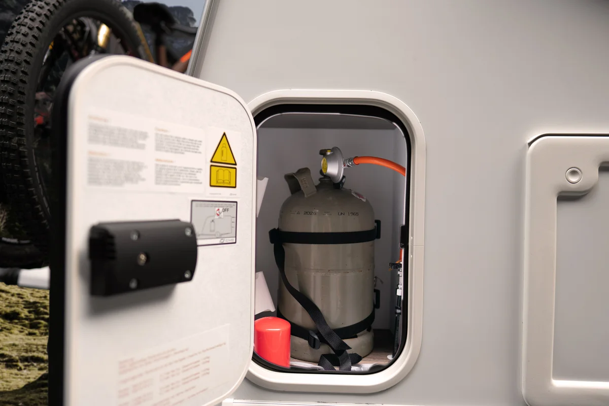 Kompakt und durchdacht auch von außen: Der aerodynamische kleine Wohnwagen für 2 bis 3 Abenteuerlustige punktet mit vielen cleveren Details. Beispiel: das integrierte, von außen zugängliche Gasflaschenfach. Der Komfort unterwegs steigt.