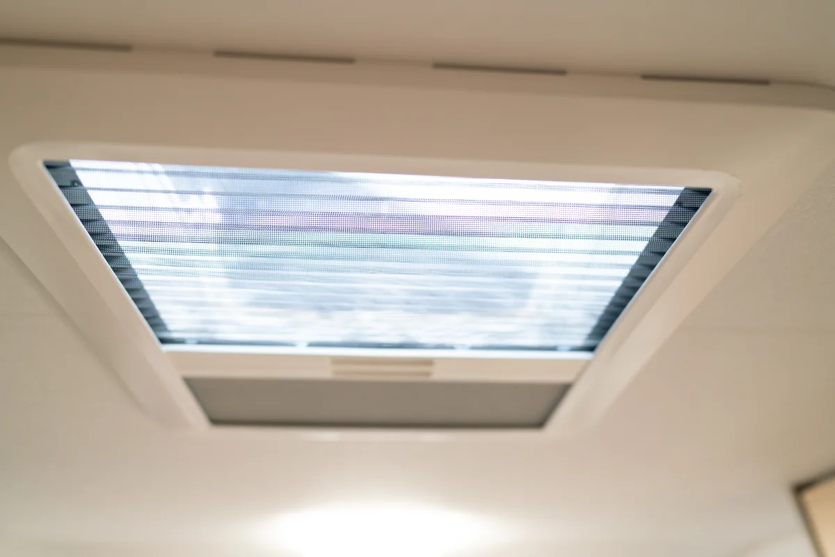 Dachhaube (Dometic) mit Griff, Zwangsentlüftung, integrierem Verdungeklungsplissee und Fliegenrollo