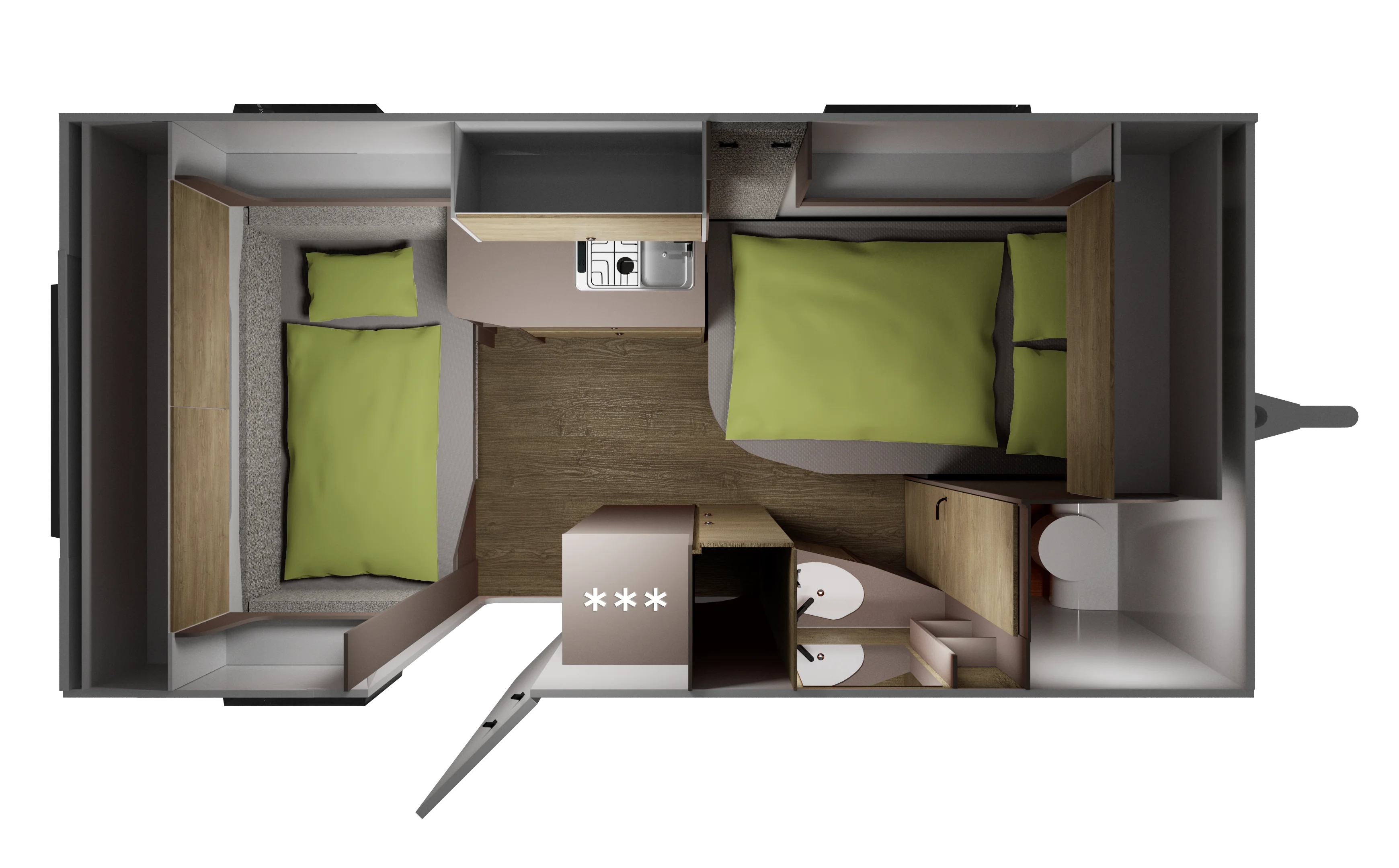 Der kleine Wohnwagen für 2 bis 3 bietet alles für NEXT Generation Camping: Ein stabiles Chassis, gute Isolierung, Frischwassertank mit Außenbefüllung, Heizung, Schlafbereich, eine funktionale Küchenzeile mit Kochfeld und Stauraum sowie ein Waschbereich mit WC.